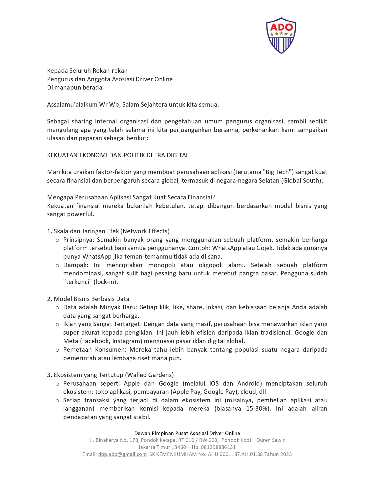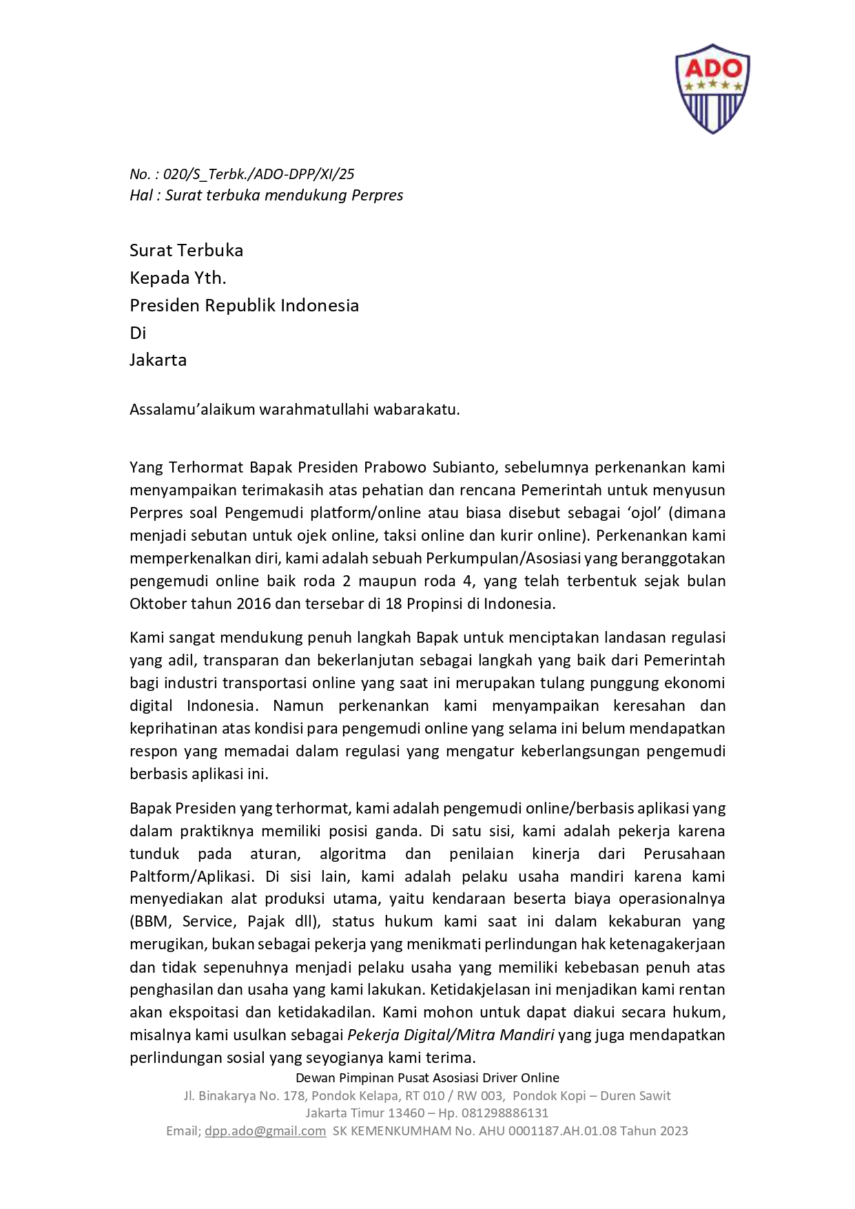 Asosiasi Driver Online (ADO) merupakan afiliasi dari sejumlah komunitas serta individu driver online, baik Roda 2 maupun Roda 4 yang terbentuk dari kesamaan visi dan misi sebagai pelaku usaha Transportasi Online yang menginginkan suatu wadah yang dapat membela dan/atau dapat memecahkan suatu permasalahan baik yang timbul dari aturan pemerintah maupun pihak penyelenggara (aplikasi berbasis online) serta aspirasi lainnya para driver online.
